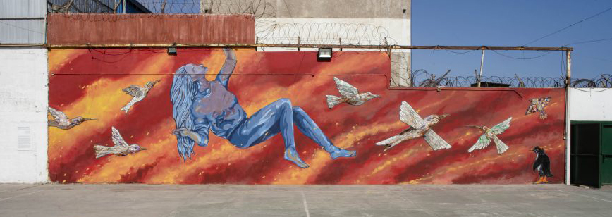 El mural presenta una figura femenina suspendida en un espacio atemporal, entre el cielo y la tierra. Brota desde el suelo como un signo de renacimiento y transformación interior, encarnando la búsqueda de paz, equilibrio y reconstrucción personal. Su cuerpo liviano, casi etéreo, contrasta con la densidad del entorno, proponiendo una imagen de tránsito más que de destino. Ocho aves distintas la rodean, representando la singularidad de cada una de las mujeres participantes, sus trayectorias, deseos y anhelos. Cada ave funciona como una extensión simbólica de sus voces, integradas en un gesto colectivo que no borra las diferencias, sino que las pone en diálogo.