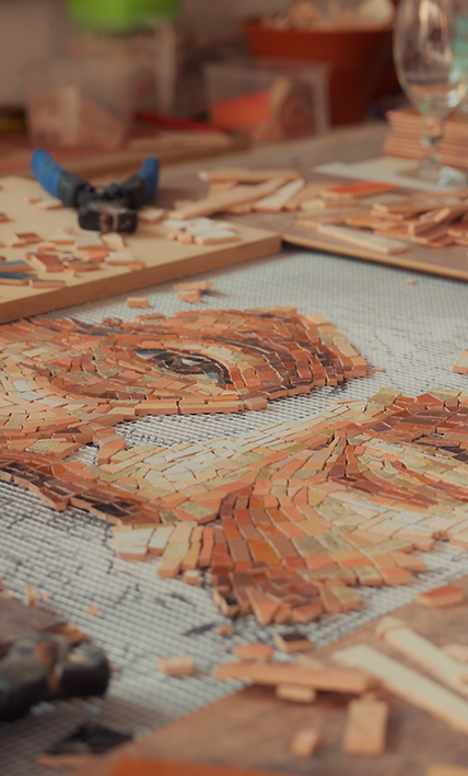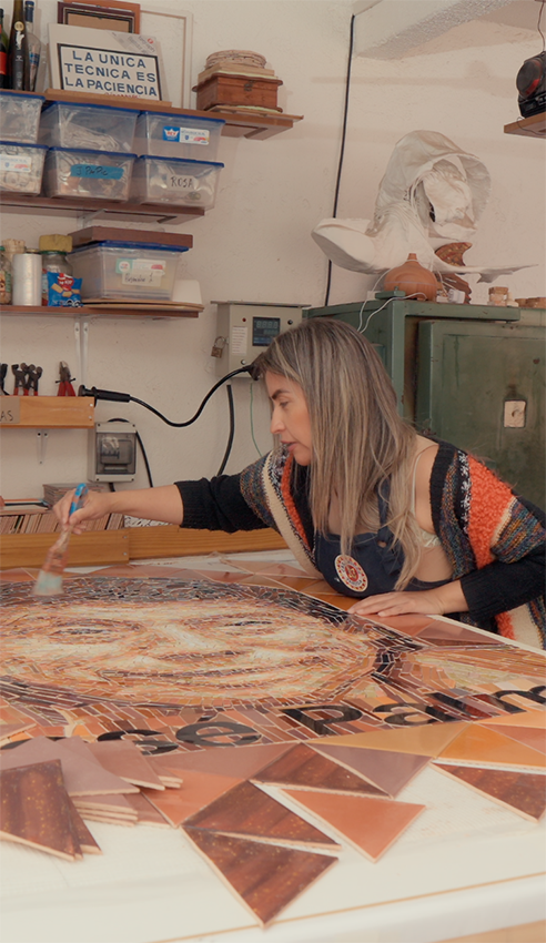 La materialidad fragmentaria del mosaico establece un paralelo con la naturaleza colectiva del teatro: múltiples gestos, voces y presencias que, al articularse, construyen sentido. Desde esa lógica, la pieza propone leer la práctica teatral como una arquitectura de vínculos, donde pedagogía, creación y gestión cultural se funden en una misma continuidad. La trayectoria de Ramos —ligada a procesos formativos, compañías universitarias y circuitos latinoamericanos— se traduce aquí en una imagen que fija lo efímero de la escena en una superficie permanente.