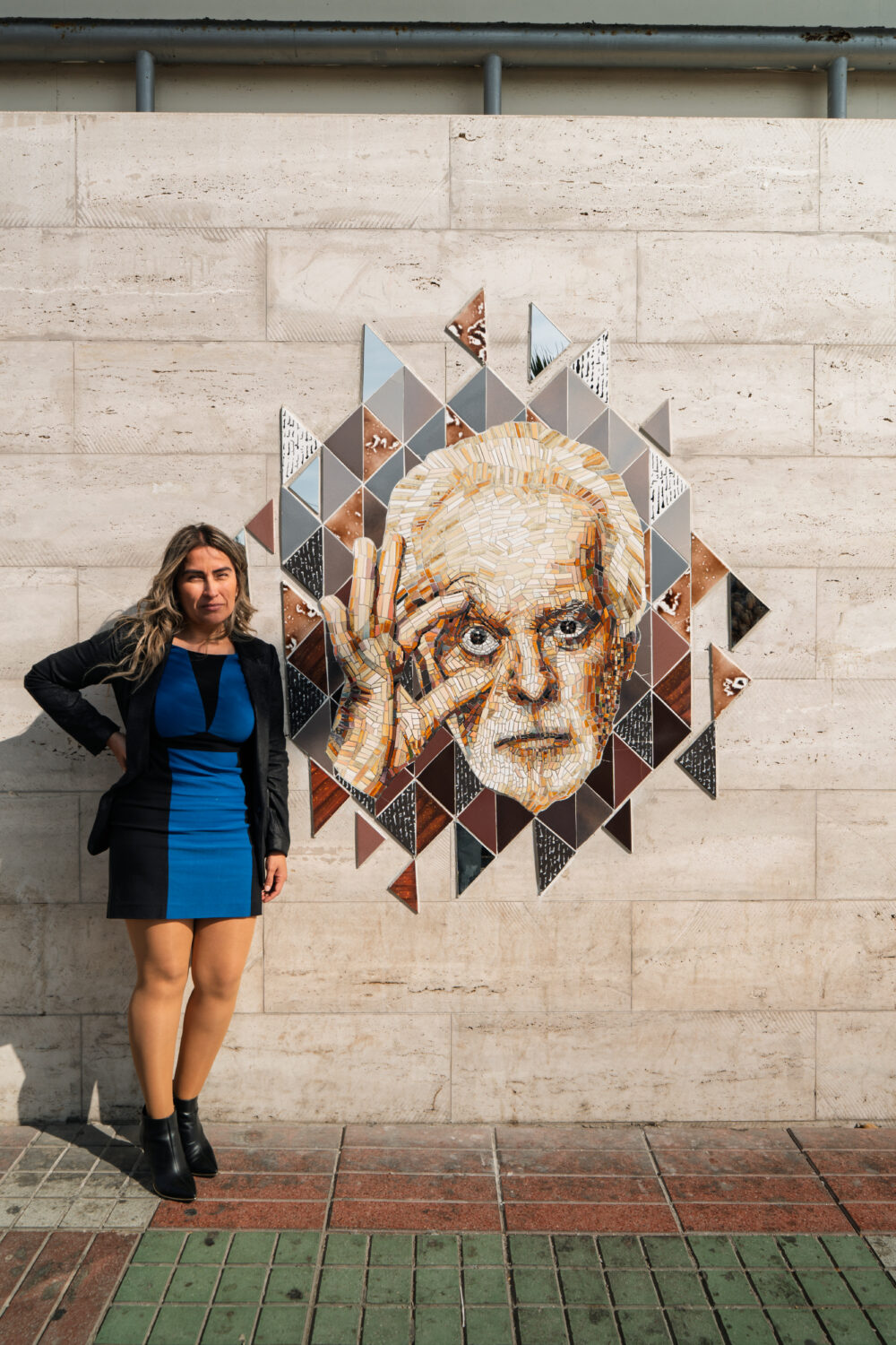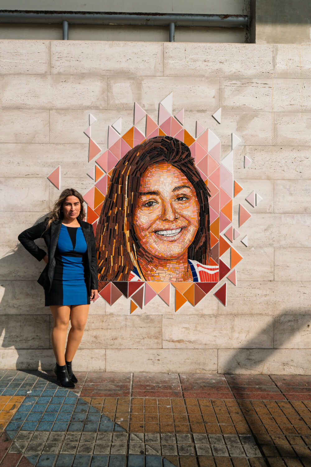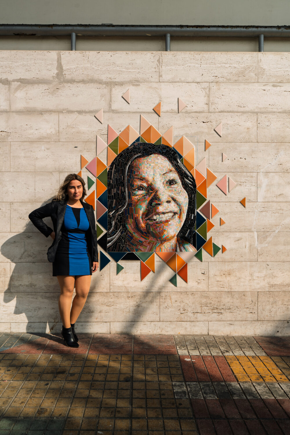 La obra de Nanda Yasoda vuelve a desplegar aquí una espacialidad precisa, rigurosa y profundamente situada. En esta nueva etapa del proyecto, la artista desarrolla un territorio visual donde nada queda al azar: cada tesela, cada vacío, cada color responde a una lectura sensible del personaje y del lugar que lo sostiene. En conjunto con Gonzalo San Martín y con el trabajo meticuloso de su asistente Leonardo Rojo, la artista ha construido un cuerpo de obra pulcro, lleno de detalles, donde la curaduría de su propio estilo —único, reconocible y sostenido por años de oficio— logra poner en valor a figuras esenciales para Tocopilla.